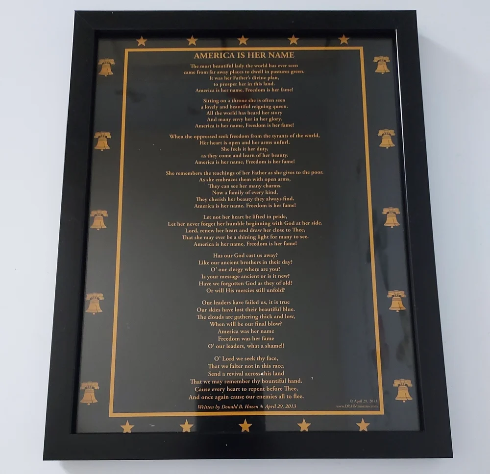 A beautiful patriotic poem that speaks to everyone about America’s role as the leader among nations. You will feel the deep concern Pastor Don Hazen shares with all true Americans about our need to turn back to God. He has chosen to surround those inspired words with the American flag and a beautiful frame.