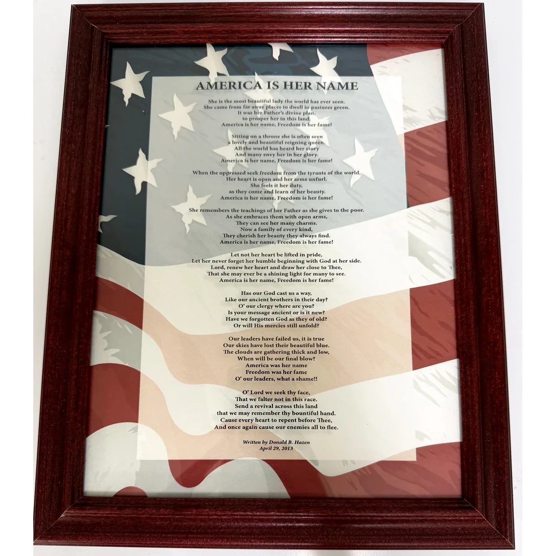 A beautiful patriotic poem that speaks to everyone about America’s role as the leader among nations. You will feel the deep concern Pastor Don Hazen shares with all true Americans about our need to turn back to God. He has chosen to surround those inspired words with the American flag and a beautiful all-wood, American-cherry frame.