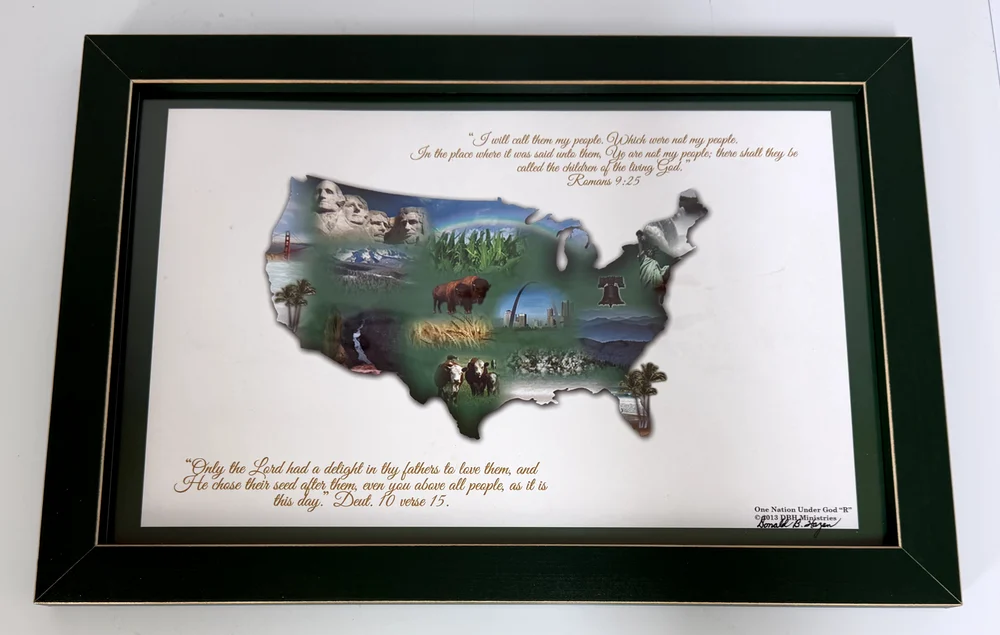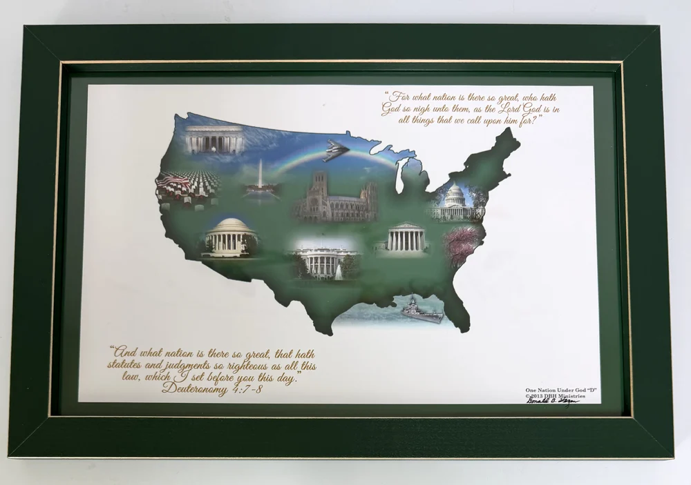 These two pictures, shown in a dark, forest-green frame, reveal at least a part of what she actually saw from the top of Pike’s Peak as well as what she envisioned. The true beauty of America is seen in the spirit of our Judeo Christian beliefs as well as in our Constitution, which guarantees our freedom of speech and freedom to worship our God according to the teachings of His word. 11×17 and 24×36 available. Shipped directly from the factory. This price is for the pair.